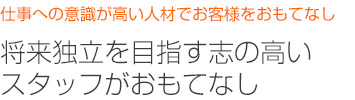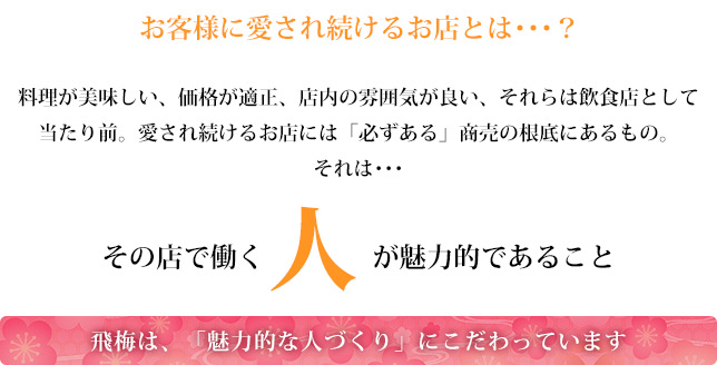 就業時間だけ仕事のことだけを考えていればいい、普通はそうかもしれませんが、お客様の想像や期待を超えるような接客サービスには、やはりスタッフひとりひとりの仕事に対する意識が大切です。飛梅が独立開業制度を設けている理由のひとつに、将来は独立したいという野心を持った志の高い人材を集めることで、質の高い接客サービスをしていきたい、そんな想いも込められています。